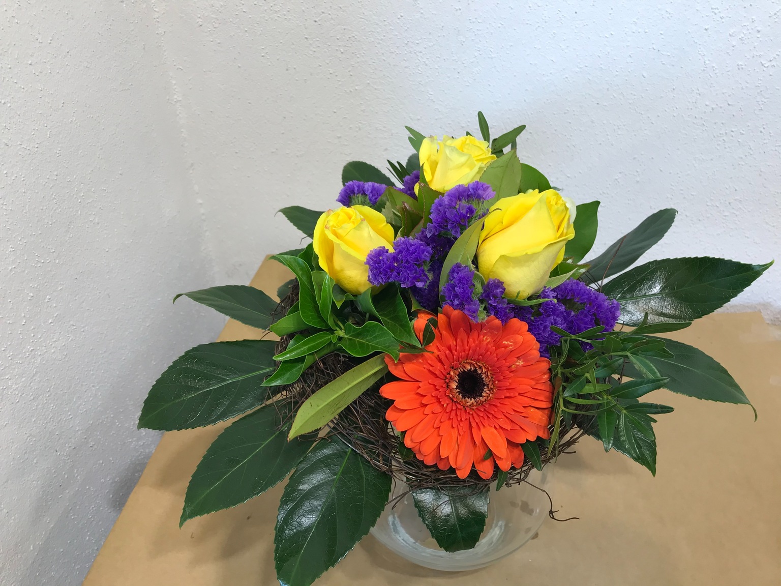Blumenstrauß kurz gelb-orange-violett