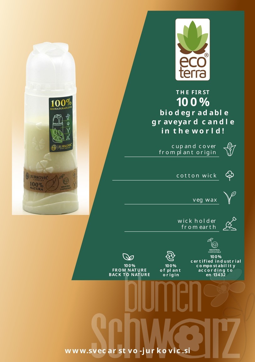 Wir haben Sie im Sortiment: Die weltweit erste Grabkerze aus 100% nachwachsenden Rohstoffe. Kompostierbar in Industriekompost (mind 60°C),