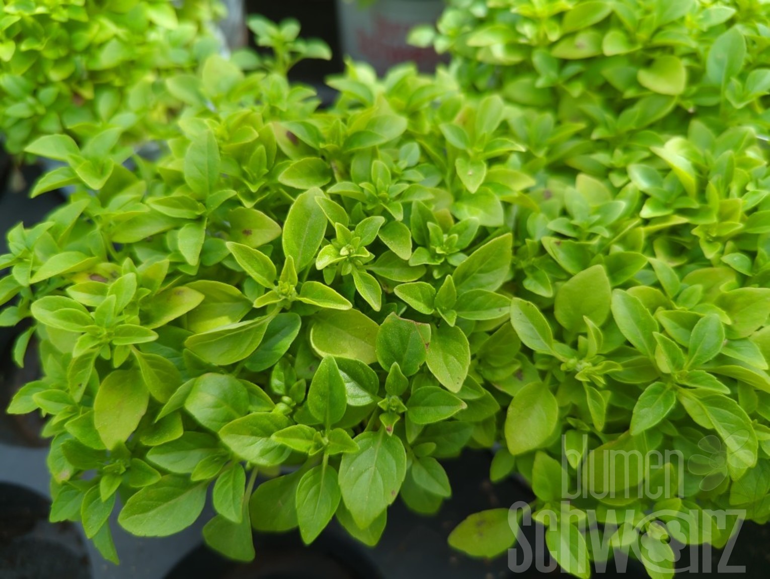 Starkwachsendes Buschbasilikum Ocimum x hybrida minimum Lamiaceae kleine, stark aromatische Blätter weiße Blüten sonniger Standort gut geeignet für Kübel